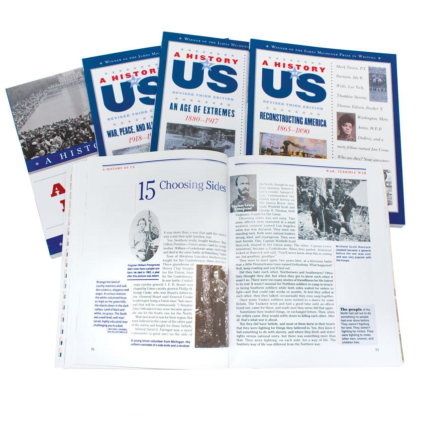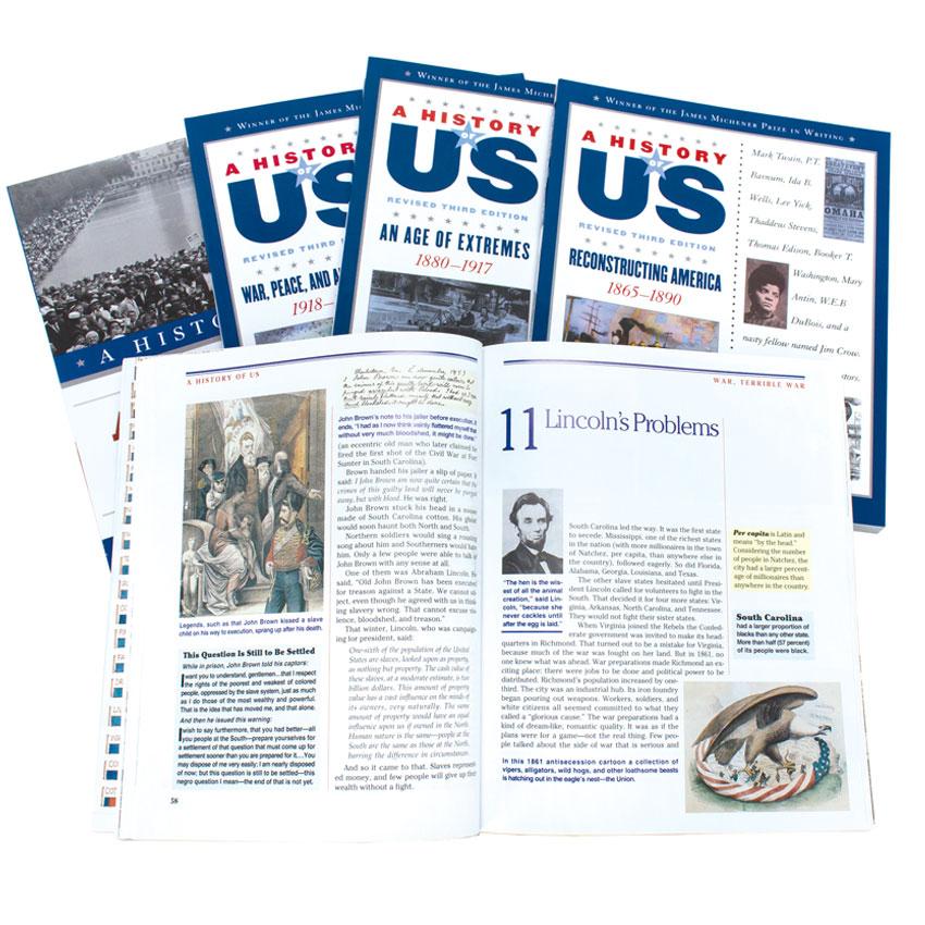 Are you looking for an American History course that encourages critical thinking about events past and present, engaging enough that the information sticks? A History of US tells a clear story of United States history with scores of illustrations, photographs, and fascinating sidebars. This award-winning series brings American history to life through occasional first-person comments and striking short biographies. With no religious undertones, A History of US works well for families using charter schools and any family who has a passion for a thought-provoking US history narrative that spans from the earliest unwritten eras to the 21st century. A History of US consists of 10 paperback volumes, neatly divided into two parts, each of which can be completed within a school year.