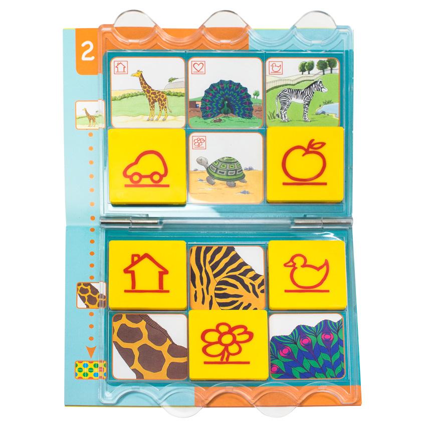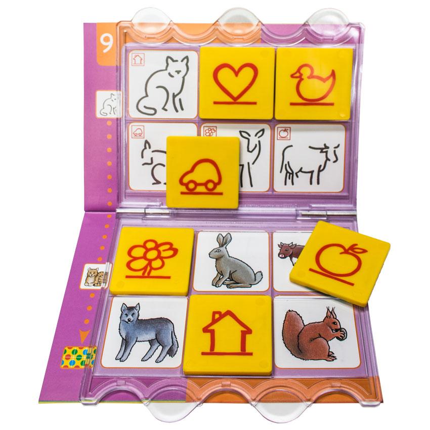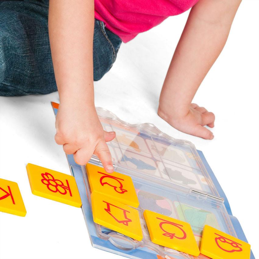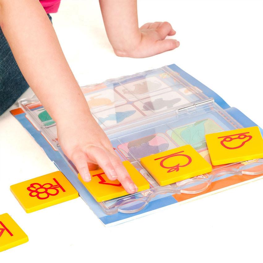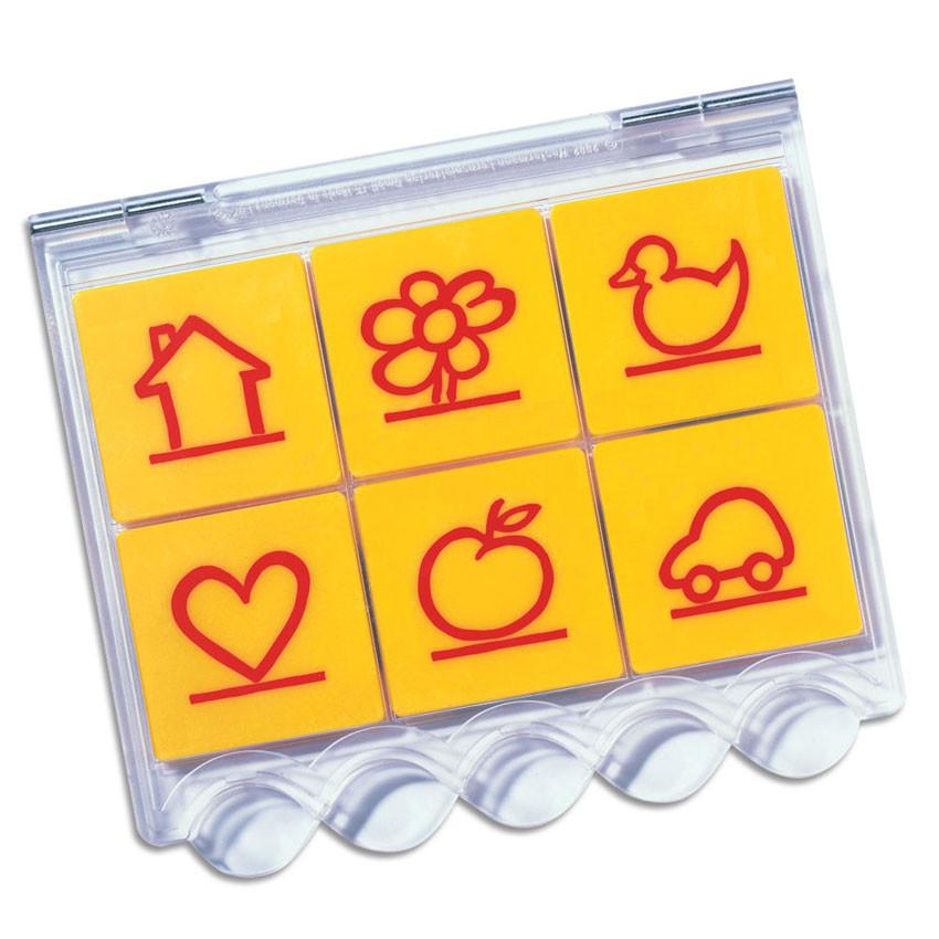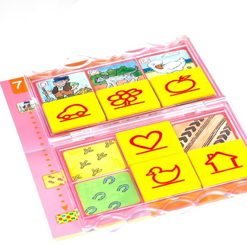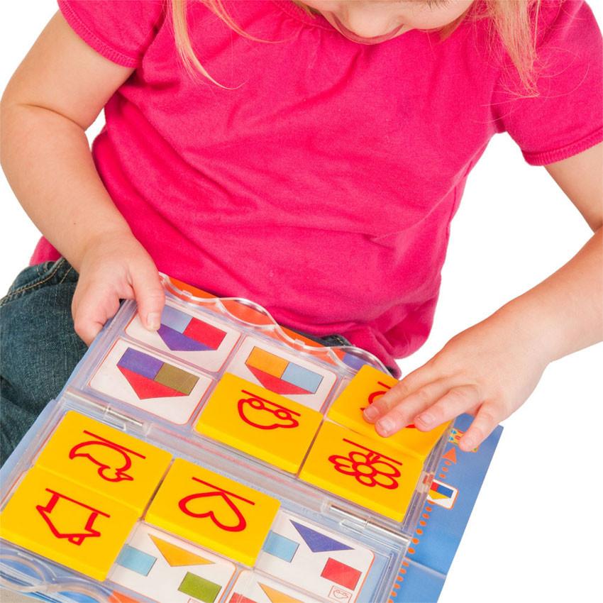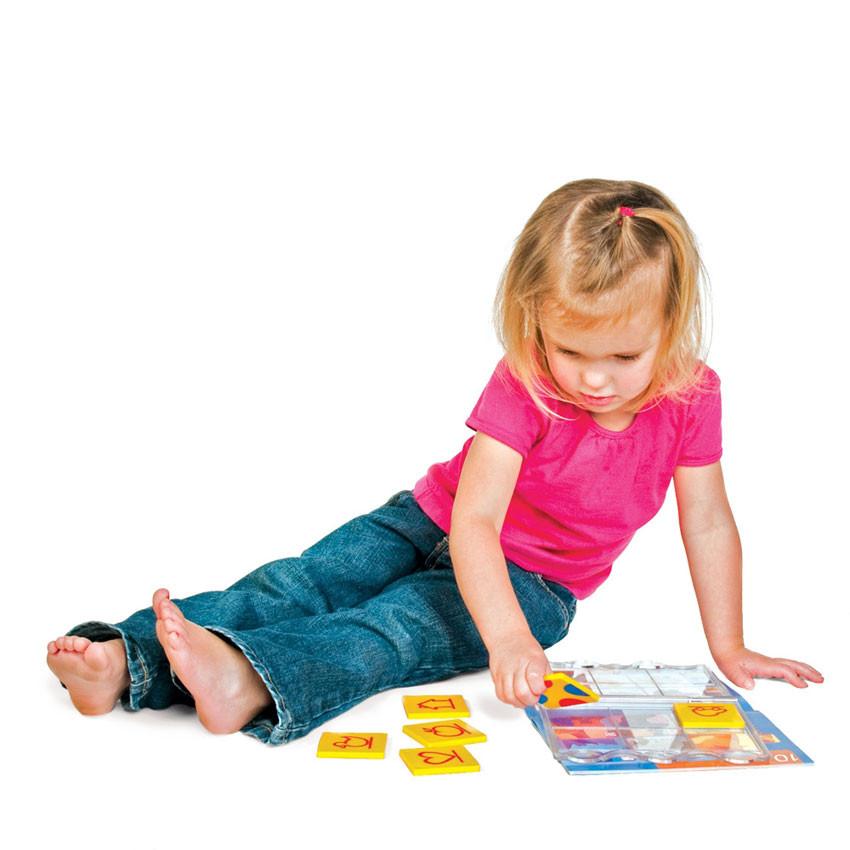 The six large and sturdy tiles have a familiar picture symbol on one side and a colorful dotted pattern on the back. The decision to use symbols instead of numbers allows even very young children to play. When your child finishes the exercises in one of the books, he closes the lid and flips the controller. The colorful dotted pattern on the back will let him know if his answers were right.