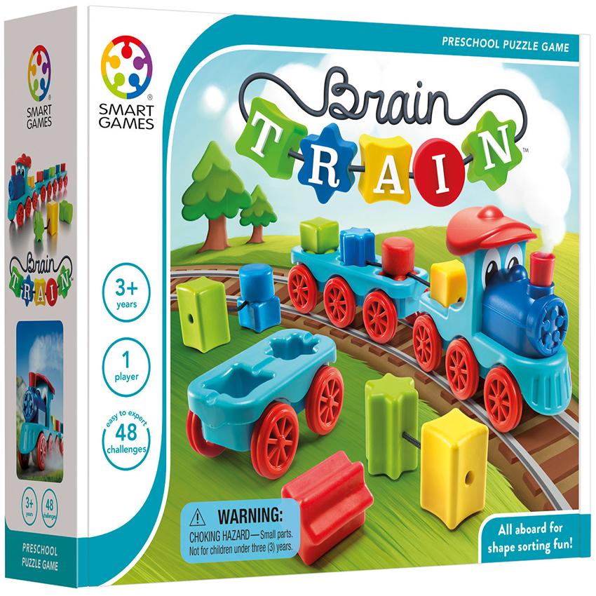 Brain Train includes three train cars, five shape segments (nine colorful shapes altogether), and a booklet with 48 challenges. Brain Train is recommended for ages 3+.