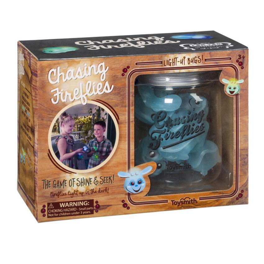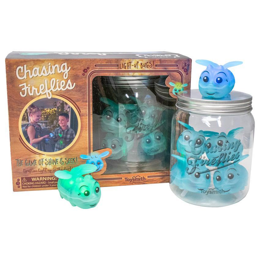 Encourage cognitive development and engage in healthy active play with Chasing Fireflies. This unique game of hide-and-seek uses 10 bemused plastic fireflies that gently flash. Played indoors or out, in broad daylight or at night, the fun begins after an adult hides the fireflies. The children then race to find either blue or green fireflies, there are five of each color. Once found, they are placed into each their own plastic mason jar. Whoever finds all five of their colored fireflies first wins.
