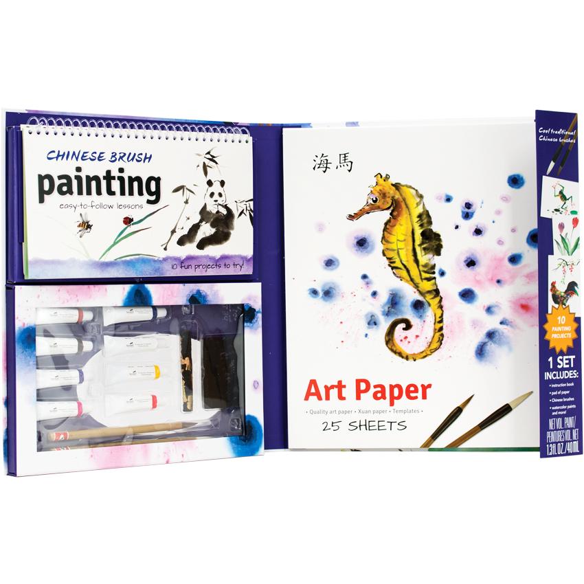 Instruction book 1 pad of art paper 8 watercolor paints (net vol. 40 ml/1.3 fl. oz) 2 Chinese paintbrushes 1 ink stick 1 ink stone 5 sheets of Xuan paper 5 animal templates