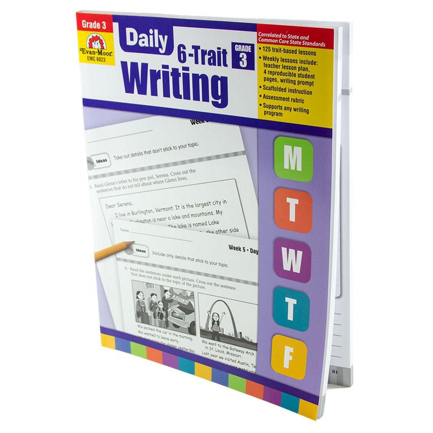 The six traits or characteristics that shape quality writing are content; organization; word choice; sentence fluency; voice; and conventions, which include grammar, spelling, and mechanics. It may sound ominous, but Daily 6-Trait Writing has made it effortless.