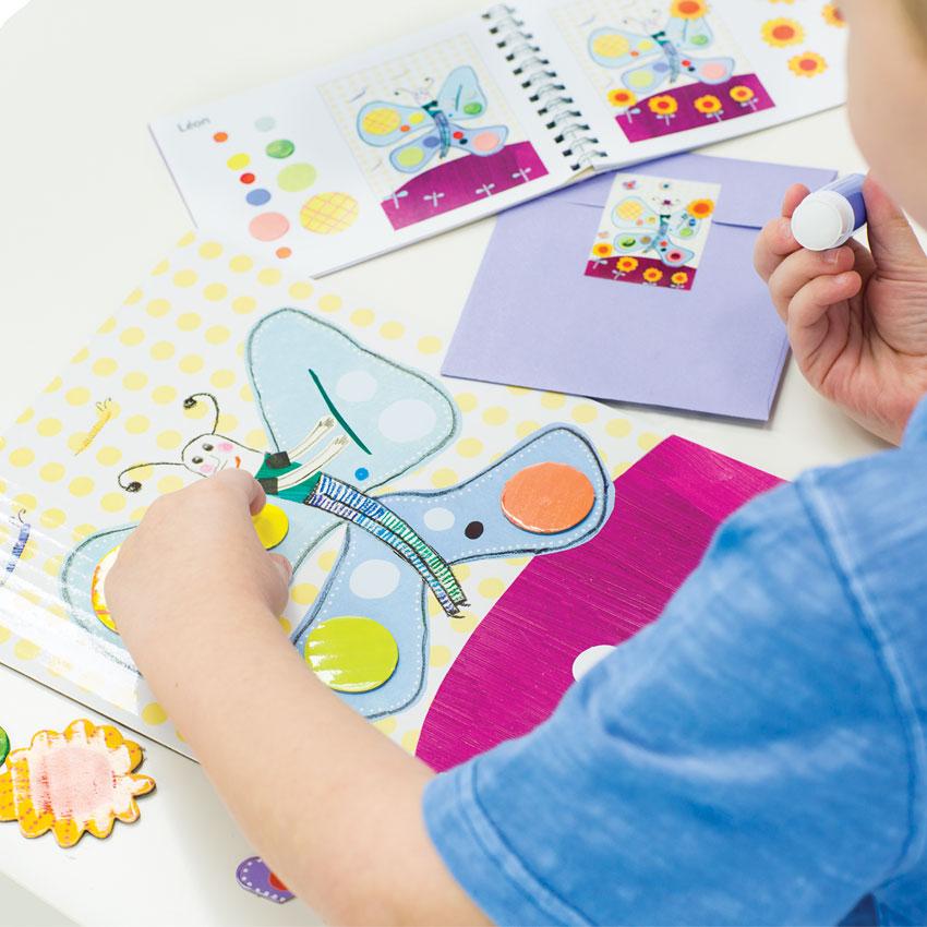 4 pictures to complete 4 envelopes containing many pieces to stick on 1 glue stick Color instruction book