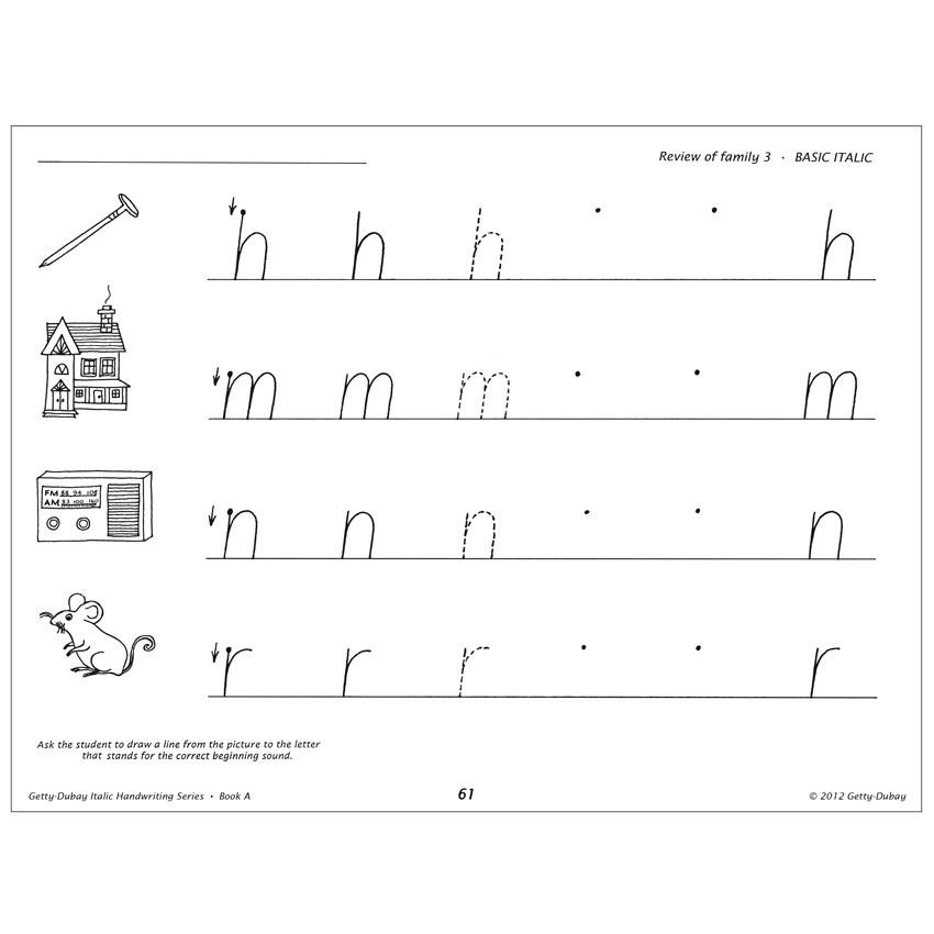 With clever illustrations and plenty of space for writing and drawing on each individual letter page, this first book in the Series provides practice with basic shapes and introduces basic italic lowercase families and capitals, one letter per page. Includes numerals.