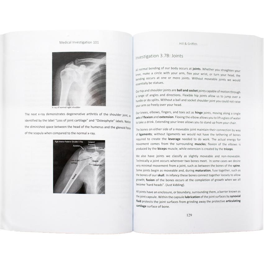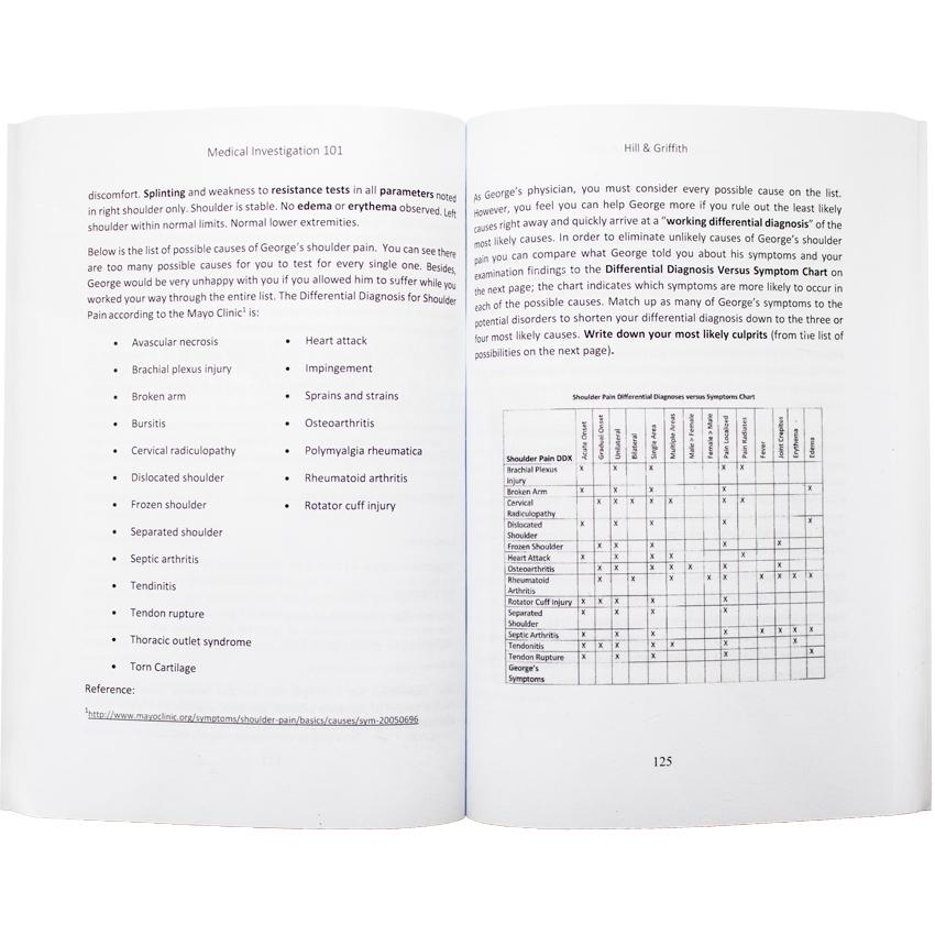 The major theme of the Medical Investigation 101 book is the medical diagnostic process using a variety of realistic case studies. Starting with the patient’s chief complaint, the student is instructed to also consider symptoms, examination notes, the patient’s medical records, and so forth.