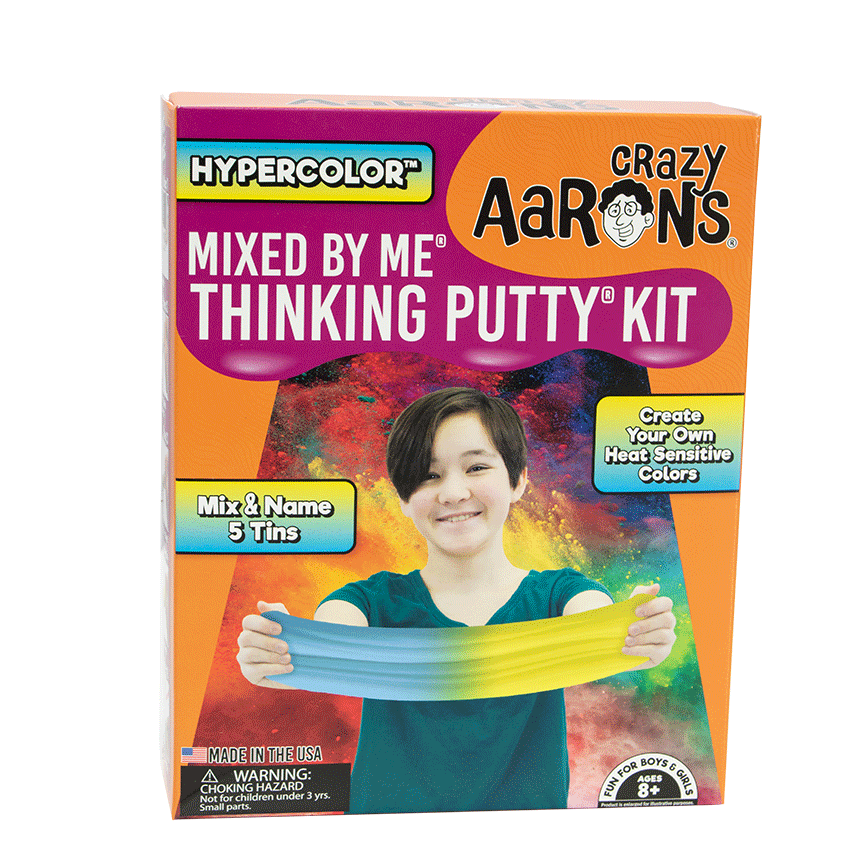 With Hypercolor Mixed by Me, your child will create their very own color-changing Thinking Putty that transforms with the heat of their hands. Each Hypercolor Mixed by Me kit includes five tins of clear putty, three Chiller Concentrates (to create your putty’s natural hue), three Thriller Concentrates (to create the warmer-temperature color), and an instructional mat. Plus, Crazy Aaron has created a series of instructional videos to train your children in advanced to expert hypercolor formulas. Design, mix, and enjoy your marvelous color-changing Thinking Putty!