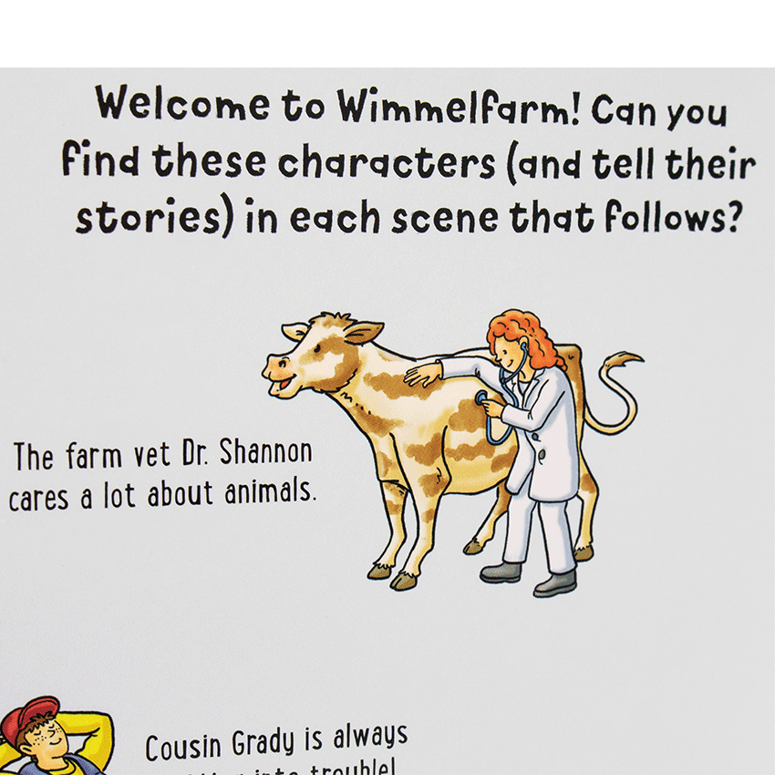 Hugely popular in Germany and around the world, here’s how Wimmelbooks work: At the beginning of each Wimmelbook, children are introduced to a cast of about a dozen characters such as Molly the mechanic, Sergio the boss, or Rusty the dog. As your child flips through the book, he will be looking for those characters hidden in plain sight among the hustle and bustle of their Wimmelworld. Each character has a different storyline that unfolds from page to page as he moves through the depicted scenes.