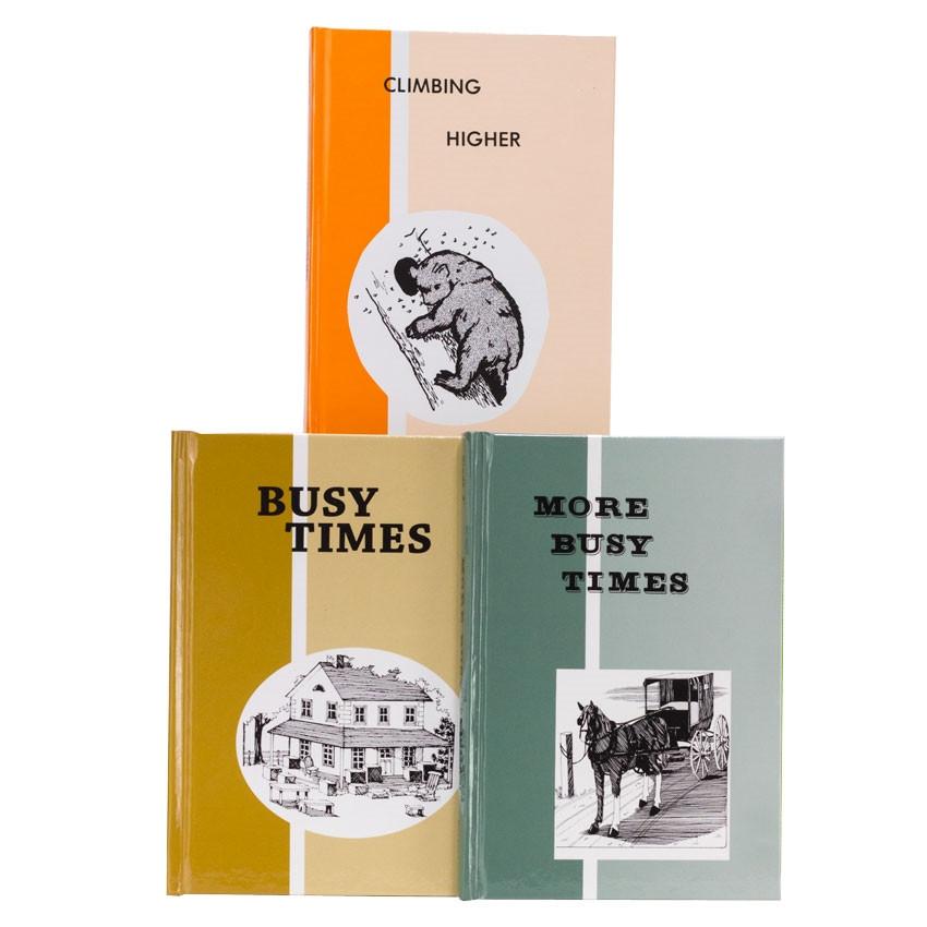 Because the Amish don't use electricity, you won't find stories dealing with the latest in films, computers, or TVs. Instead, the stories are centered around farm life, with horse auctions, harvests, and LARGE families. We have compared these books to several home school basal readers and have found that they are more challenging in the lower grades and infinitely more interesting. With simple typesetting and a few black-and-white sketches, these hardback books are not splashy, but are lovely in their simplicity.