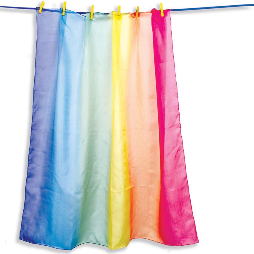 Light, flowing silk. Hand hemmed. Dyed with non-toxic dyes in the USA. Packaged in a lively paper wrapper that gives ideas for play. Safety tested for ages 3+.