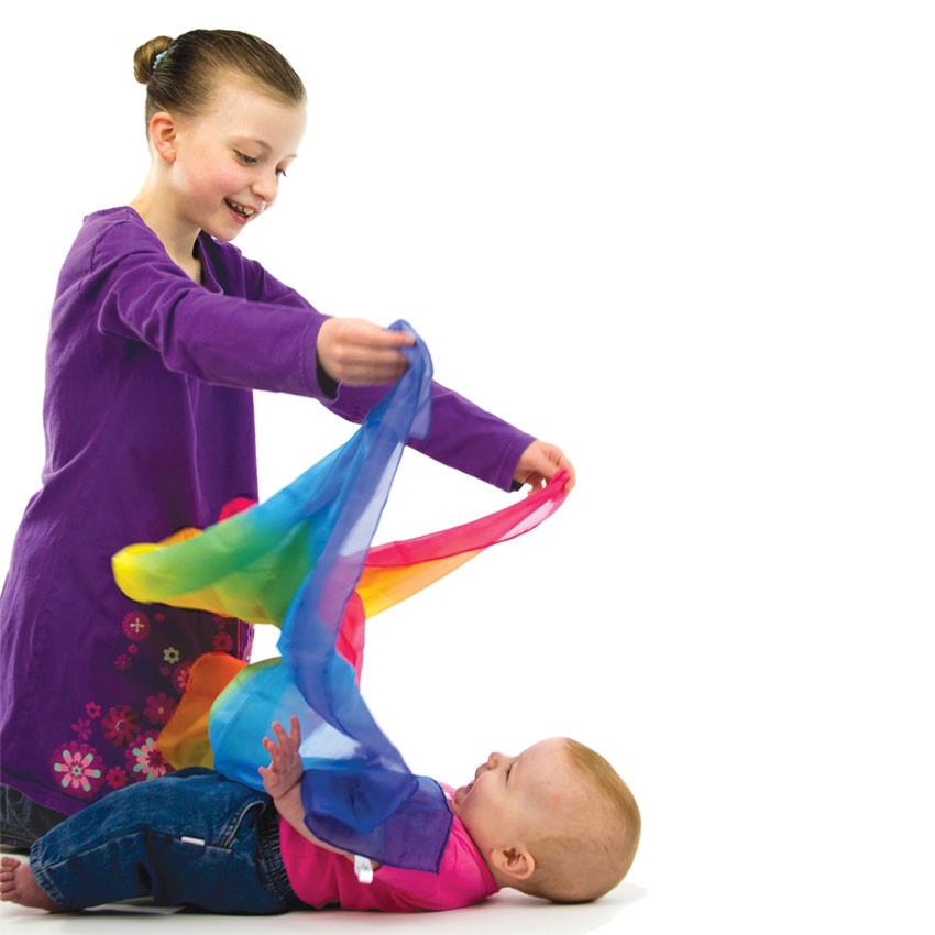 Simple and natural, PlaySilks have been recommended for nearly one hundred years to encourage children to use their imagination and creativity. The sumptuously soft feel of PlaySilks is ideal for developing babies. Wispy enough for a tiny baby to manipulate, PlaySilks provide a wonderful sensory experience. They are great for "peek-a-boo," and the lovely texture and translucency of the PlaySilk makes it ideal for "hiding and finding" games with your baby. Easily stuffed into a diaper bag or purse, PlaySilks make a soft, filmy, easy-to-pack comfy for traveling little ones.