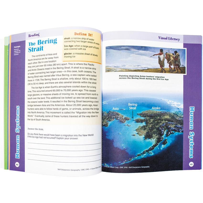 Skill Sharpeners Geography takes your child beyond just the basics of geography and includes a smattering of histories and cultures within our world. The colorful illustrations and pages will grab your child’s attention, and the handy (removable) answer key in the back allows your student to easily check his own work.