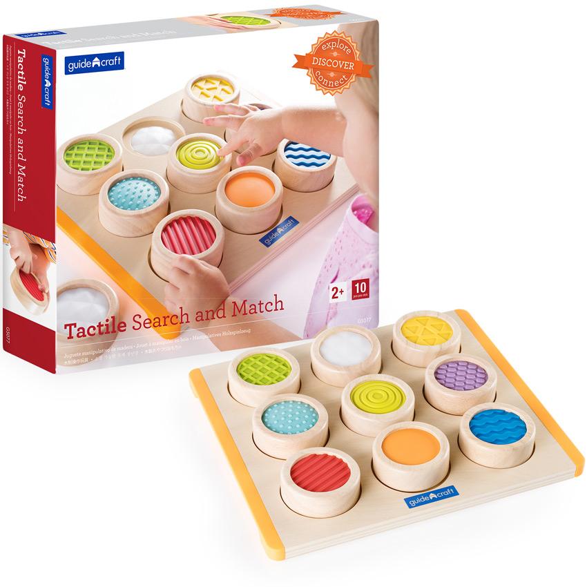 Tactile Search and Match is a sensory puzzle for toddlers. Feel and identify matching pieces from their bumpy ridges, smooth surfaces, soft plush exteriors, and more. Nine different textures on oversized rubberwood puzzle pieces match to a corresponding spot on the sturdy puzzle board.