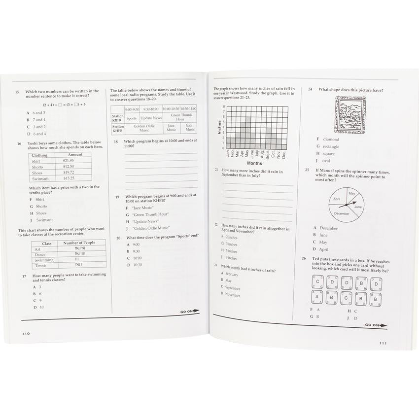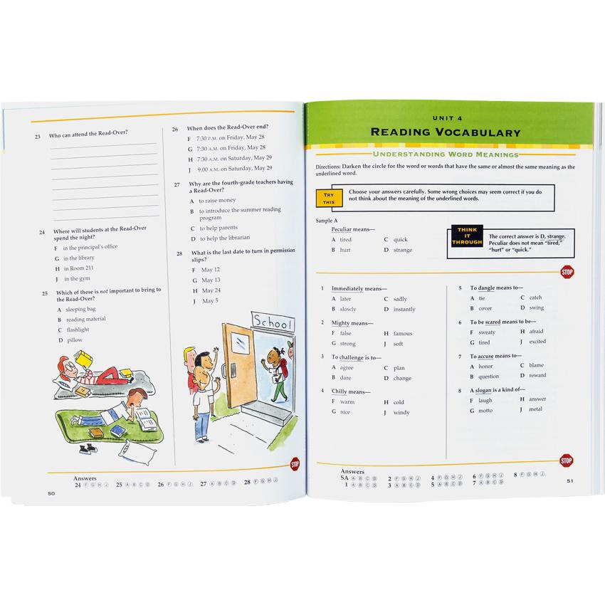 Based on subject areas covered by most state standardized tests, these colorful, inviting workbooks provide a good sampling of all the skills required of each grade level. Practice pages, strategies, tips, and full-length practice tests build test-taking confidence and skills in subjects such as reading comprehension, vocabulary, language, and math. The test tips are beneficial, and the information and instructions are super-easy to follow.