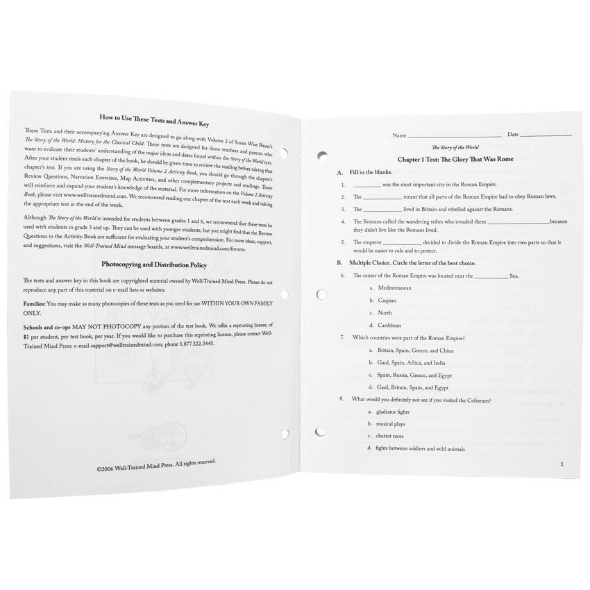 42 Tests: one for each chapter of The Story of the World. Perfect for evaluating comprehension and retention. The narrative format of The Story of the World helps children remember the famous people, places, and events in history. These tests offer you an easy way to make sure that your child is absorbing the important events from world history. A combination of multiple choice, matching, fill-in-the-blank, and short writing samples allow you to evaluate your child's retention and comprehension of key events in The Story of the World.