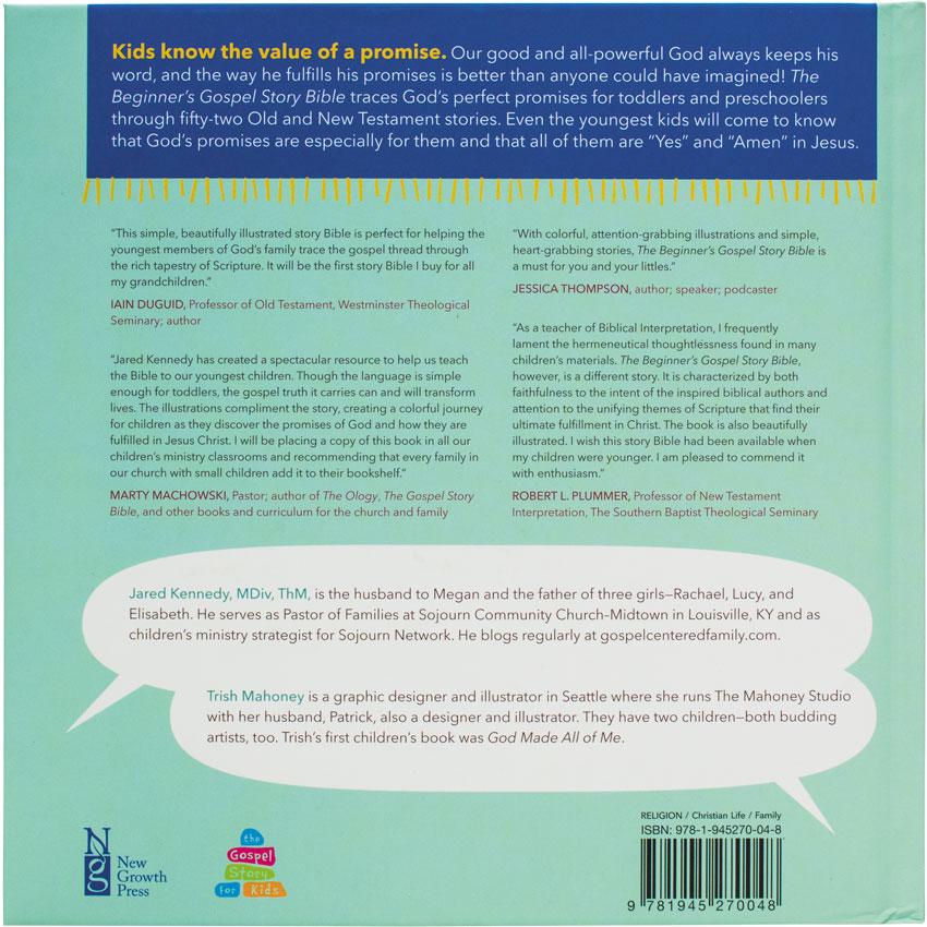The illustrations are simple, captivating, and stunning, and the minimal text is clear and theologically correct. Because God’s promises are at the heart of the gospel, The Beginner's Gospel Story Bible focuses on them throughout, with the Old Testament section titled, "Promises Made," and the New Testament, "Promises Kept." Stories highlight God’s plan of redemption through Jesus and the unexpected ways God’s grace and mercy are revealed throughout the Bible. With The Beginner’s Gospel Story Bible, your tiniest children will not only learn key Bible stories but also basic words like sin, promise, Jesus, Savior, pray, and forgive.