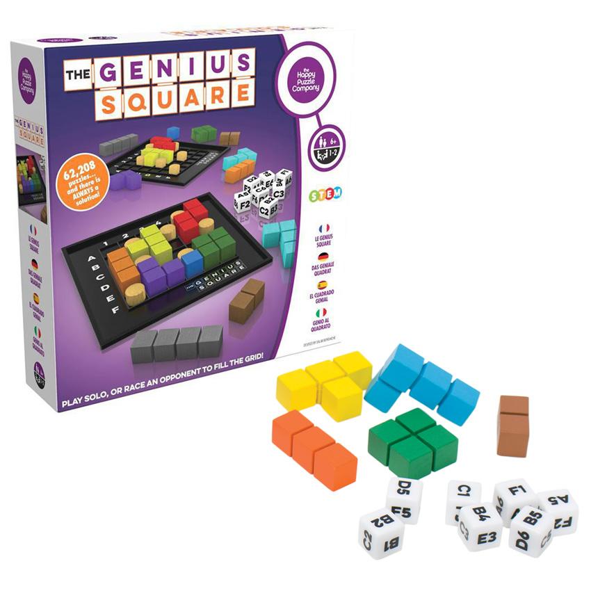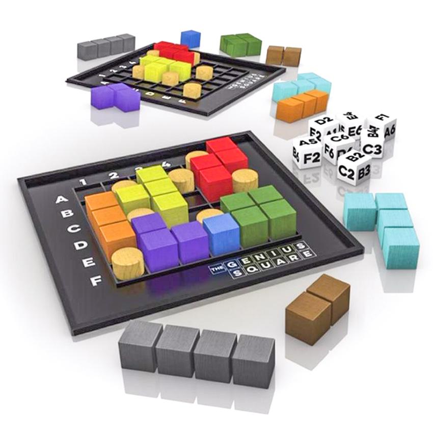 Because virtually no two games will look the same, there is an exciting element of surprise with each new game. Some combinations will be easy to solve, others much harder. The first player to complete their grid wins that round. The Genius Square is a STEM board game that promotes problem-solving, spatial awareness, logic, strategic planning, visual discrimination, motor manipulation skills, and concentration. The Genius Square has been recommended as a useful learning tool for individuals with dyslexia or dyspraxia. It can also be played using non-verbal communication skills. The Genius Square comes with two molded plastic boards with raised grid patterns on which blockers and the block shapes are placed, two sets of nine painted wood shapes, two sets of seven blockers, seven dice, and complete instructions are also included.
