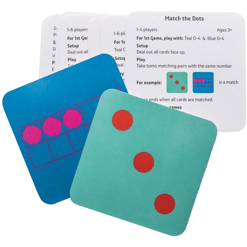 For the beginners, Hungry Numbers is perfect. The purple numbers will only eat cards with the same number of dots as their value. Older children play Polka Dot Tens, looking for pairs among face-up cards, of numbers that add up to ten.
