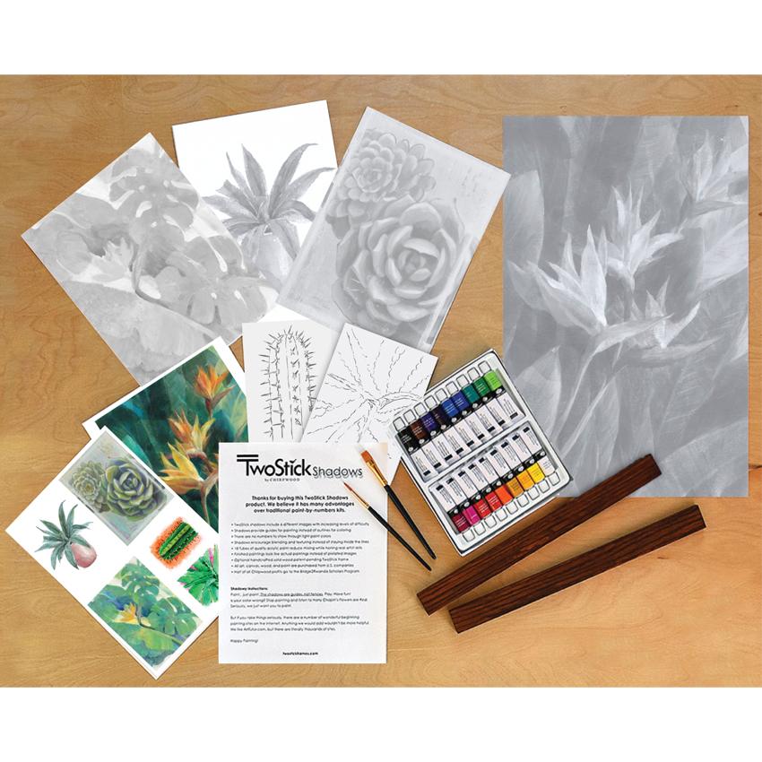 Each TwoStick Shadows Paint Kit includes six canvases, 18 tubes of acrylic paint, two synthetic paintbrushes, a simple two-stick oak frame, and instructions.