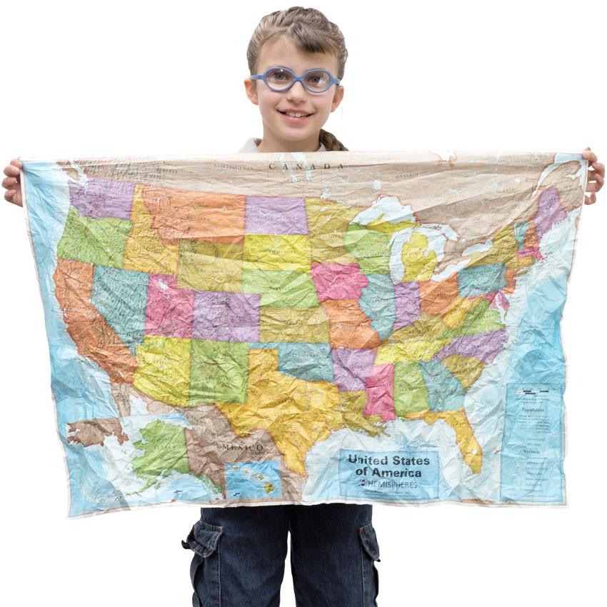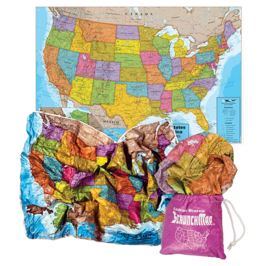 Wall maps are great, unless you want access to them in another room. Portable maps are convenient, until you need to put them away and face the complex origami of the traditional map. Now you have both convenience and portability with a ScrunchMap. Is there any easier way to fold a map than to scrunch it up into a ball and stuff it in a fist-sized bag? Printed on water- and tear-resistant material, ScrunchMaps are as kid-proof as you can get. So take your ScrunchMap out to the treehouse, down to the beach, up the mountain, and across the country; this map is designed to be a workhorse.