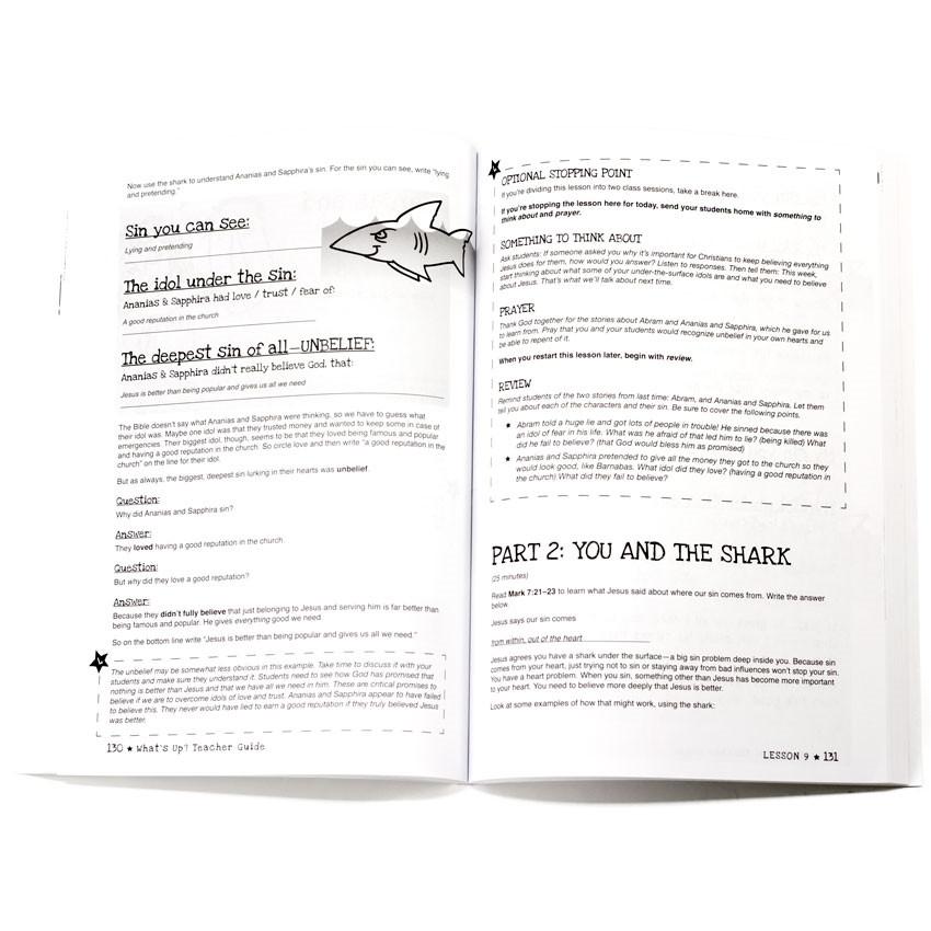 There are 15 weekly lessons, each designed to take about 90 minutes. However, in a home setting we encourage you to go at a slower pace, expanding it to 27 weeks of 45-minute lessons. This Teacher Guide includes easy-to-understand instructions and notes as well as helps and directions to make teaching the gospel to children clear and simple. You will also want one copy of the corresponding student guide for each participant. While specifically designed for a group, a parent willing to invest the time to prepare and, more importantly, willing to discuss answers, will fill the gap nicely. When our children reached around middle school age we had a special season of time for discipleship, and I see What’s Up? effortlessly taking that to a new level for families today.