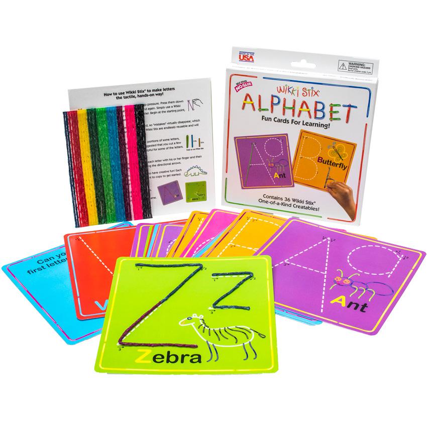 Each Wikki Stix Alphabet card also includes an item that is spelled beginning with the letter being studied (Ant for “A”; Dinosaur for “D”, etc.) that can also be traced with Wikki Stix. Reusable and unbreakable, made simply of yarn and food-grade nontoxic wax, Wikki Stix have been manufactured in the USA for over twenty years. No glue, no preparation, no cleanup, no mess Wikki Stix Alphabet is ideal for quiet times and travel. Wikki Stix Alphabet includes 26 individual cards plus 36 tactile Wikki Stix® to create hands-on educational fun.