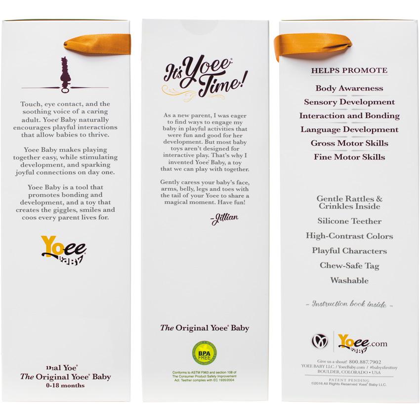 Not only can your baby be gently caressed with the long fluffy tail, the crinkle high-contrast fabrics and rattle inside of a Yoee Baby are another fun way to engage baby’s senses. The handle is designed so that both babies and adults can easily hold and play with a Yoee Baby, plus the food-grade silicone teether attached to the base of the toy can be a relief for sore gums. And don’t forget to use the adorable plush Yoee characters as a story prop to tell your baby all sorts of wild tales and stimulate language development. While each Yoee Baby comes with a simple how-to booklet, there’s no right or wrong way to use your Yoee Baby as long as you and baby are having fun.